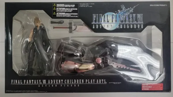 From Square Enix. Cloud and his beloved motorcycle Fenrir arrive as a set to Play Arts Kai from the world of Final Fantasy VII Advent Children! From Cloud's melancholic facial expression to his hairstyle and the Cloudy Wolf ornament on his shoulder armor, the details on all of the accessories adorning his outfit are meticulously sculpted and painted for an unmatched level of quality. There are a total of seven swords included with the figure; a fully assembled version of the Fusion Sword, and its separated version in which there are six separate pieces. Each of the six swords can be sheathed in the holders on Cloud's back. The collector can enjoy his in-movie poses from no matter what angle you look. Also included is a cloth cape piece with bendable wire for unparalleled posing possibilities! Fenrir is portrayed realistically, from its uniquely streamlined form to the burned pipes around its muffler and engine. Additionally, the motorcycle allows for storage of Cloud's Fusion Sword, recreating the bike's battle-ready design. The headlight and tail lamp light up by using three LR44/A7 button cells (not included). Also included are Cloud's goggles and mobile phone, as seen in the film, making it possible to relive the movie's most memorable scenes through this luxurious set. Figure includes display stand, interchangeable hand and arm parts.